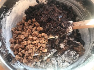 Add in the plain flour, oats, cornflour, bicarbonate of soda and sea salt and with a rubber spatula, fold until the cookie dough has just begun to form. At this point, add in the dark chocolate chunks and the Irish cream fudge chunks and continue to fold together with the spatula, making sure that the chocolate and fudge are evenly dispersed.