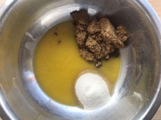 In a small saucepan or in the microwave, melt the margarine with the honey and add to a mixing bowl with the two sugars and whisk together until evenly combined. Then whisk in the egg until the batter is even.