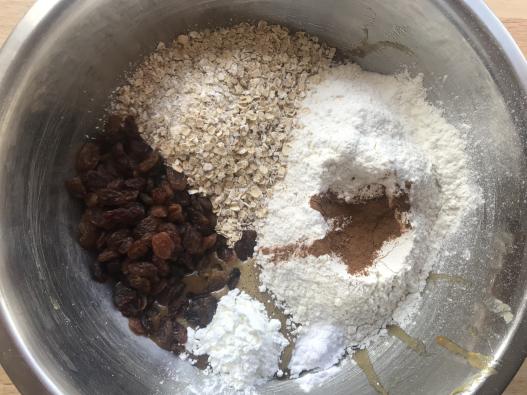Add in the flour, the oats, raisins, cornflour, bicarbonate of soda and cinnamon and fold the ingredients together until it forms a soft cookie dough.