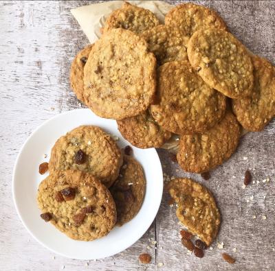 The recipe still contains cornflour and bicarbonate of soda. The addition of cornflour in the recipe helps to keep the cookies soft in the centre and the addition of bicarbonate of soda helps the cookies to spread while baking which makes the edges crisp. The use of honey keeps the cookies chewy along with the raisins and the ground cinnamon adds a really nice complementary flavour and is typical for an oatmeal and raisin cookie.