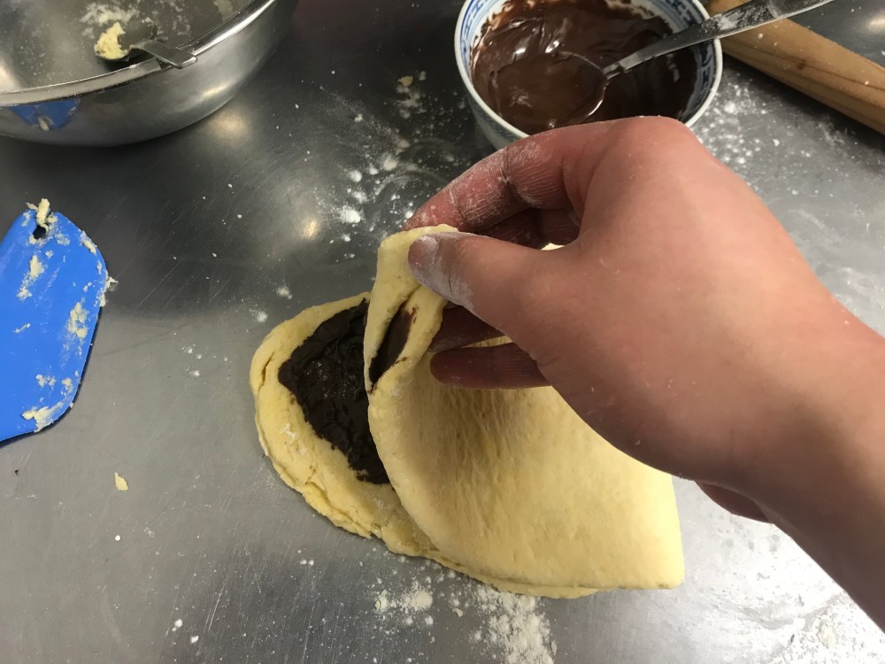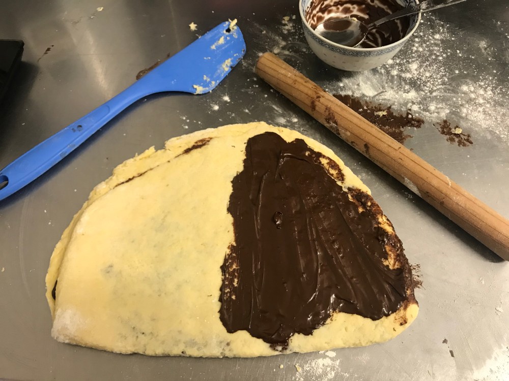 Tip out onto a lightly floured surface and press the dough together into a solid slab. Use a rolling pin to flatten out the dough into a rectangle that is 1cm thick. Spread about a third of the chocolate spread onto one half of the scone dough and fold the other half on top. Pinch the folded edges to seal the dough and stop the spread leaking out.