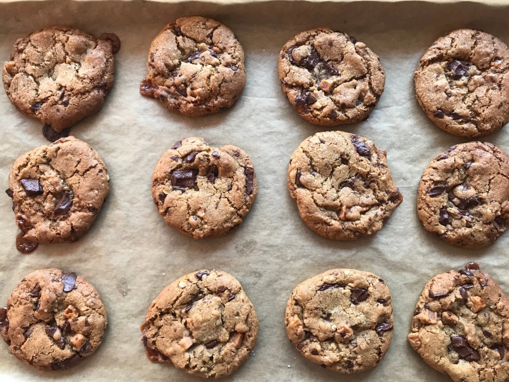 Use two spoons to scoop out 12 equal-sized rounds of cookie dough on the baking trays, leaving around 5cm between each round of dough as the cookies spread.