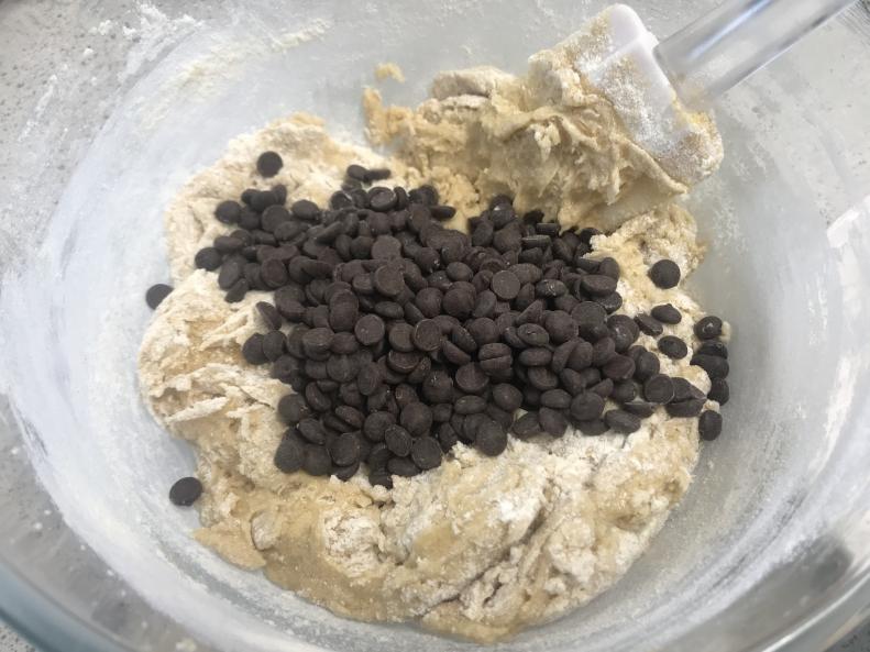 Add in the flour and baking powder and use a spatula to fold the dry ingredients in until they are almost fully mixed in. Add in the chocolate chips and fold through until the chocolate chips are mixed in and well distributed, ensuring you scrape to the bottom of the bowl to check for any loose flour.