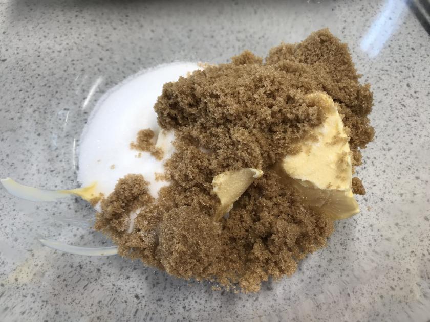 In a mixing bowl, cream together the margarine or butter with the brown sugar and the caster sugar until it is light and fluffy and the sugar has begun to dissolve. Add in the egg and the vanilla extract and beat until the egg is incorporated well. Do not worry if the mixture has curdled.