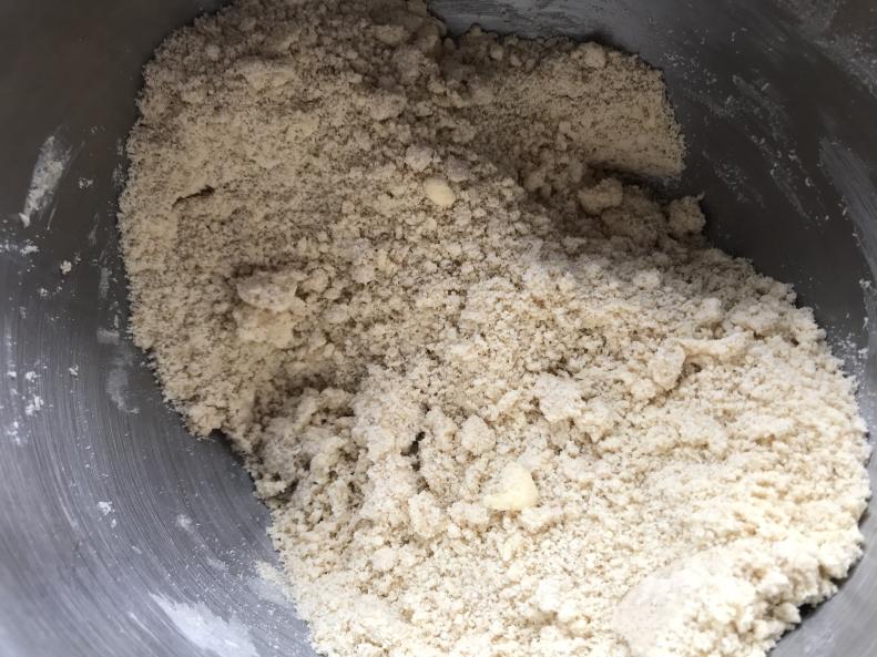 With the remaining third of the dough, break up into chunks in a bowl and add the extra flour, rolled oats and ground cinnamon. Use your hands to mix and press together until the sablé dough has absorbed the flour and turned into a streusel/crumble topping texture. Depending on how much dough you left and how soft the dough was initially, you may need to add more flour. You should have a mix of fine crumbs and clumps of dough. Place on a lined baking tray and bake for around 8 to 10 minutes until golden brown and baked through. Leave to cool.